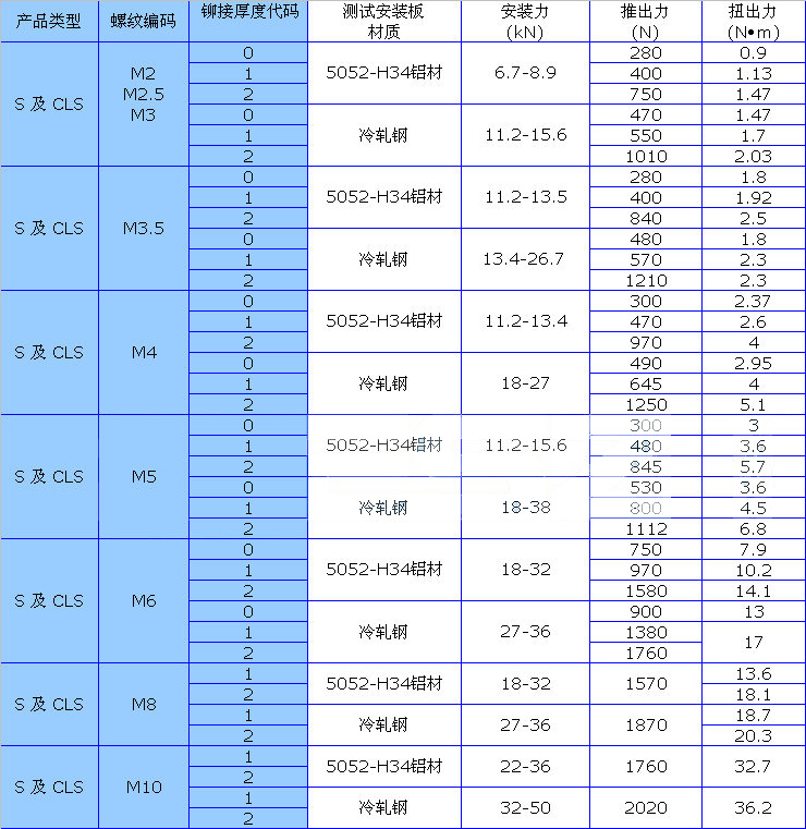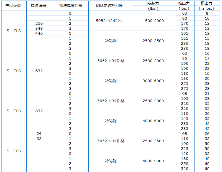 以上就是S,CLS類壓鉚螺母的安裝力、推出力、扭力標(biāo)準(zhǔn)圖表,希望可以幫到大家,如果想繼續(xù)詳細(xì)了解緊固件知識(shí),請(qǐng)繼續(xù)關(guān)注我們喲~~~