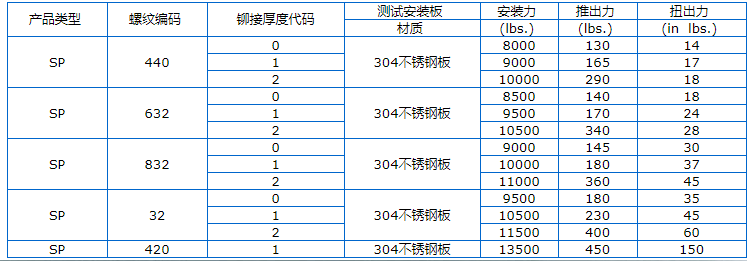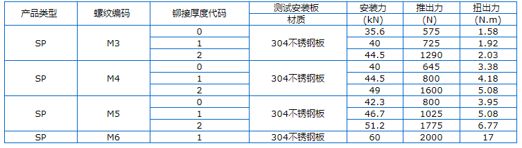 SP類不銹鐵壓鉚螺母的安裝力、推出力及扭力值