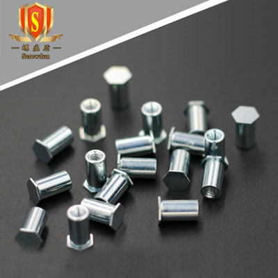 上面這種叫SO(通孔)壓鉚螺柱,當(dāng)然,還有盲孔的,就是六角這一頭是不通的,叫BSO,它長的是這樣的: